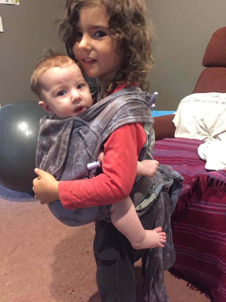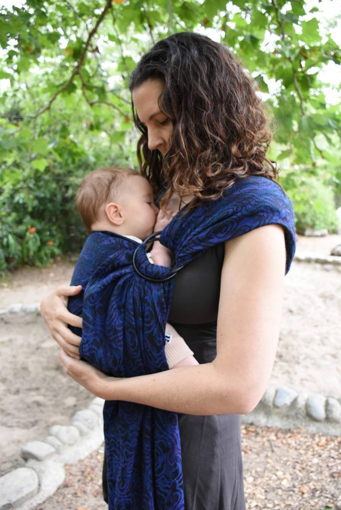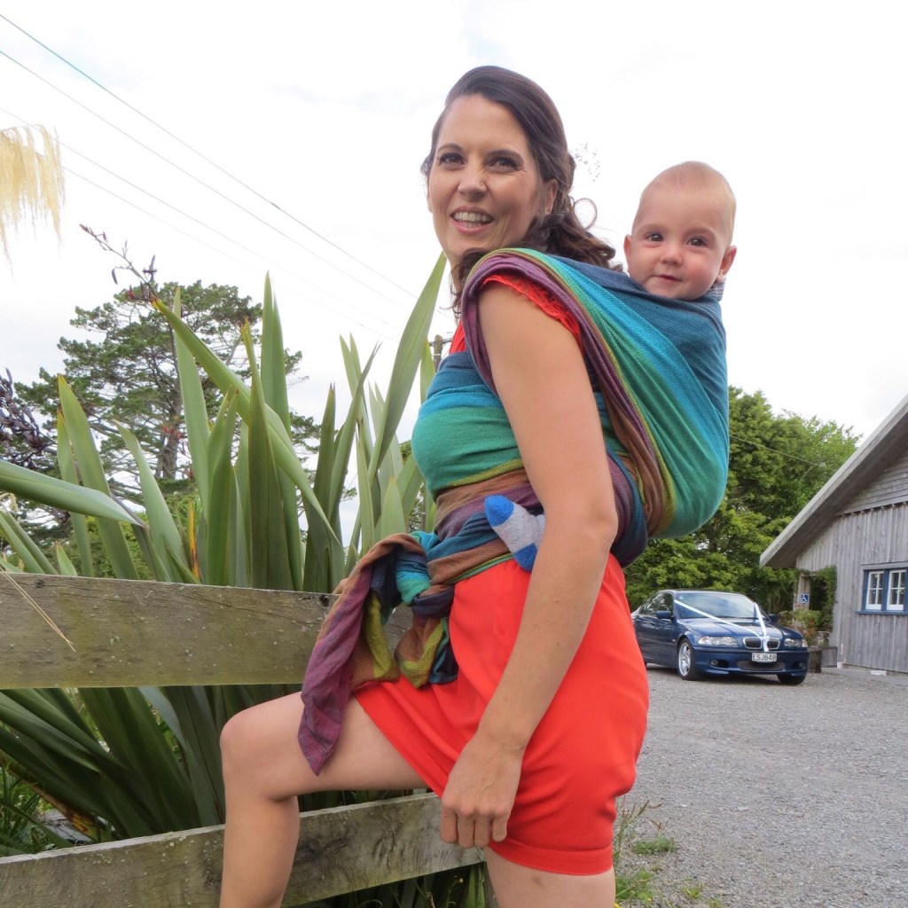Woven wraps – suitable from newborn and can be used for front, hip, and back carries. They come in a variety of lengths and can be used in any number of carries. They are lots of fun and very versatile, but there is a learning curve involved!