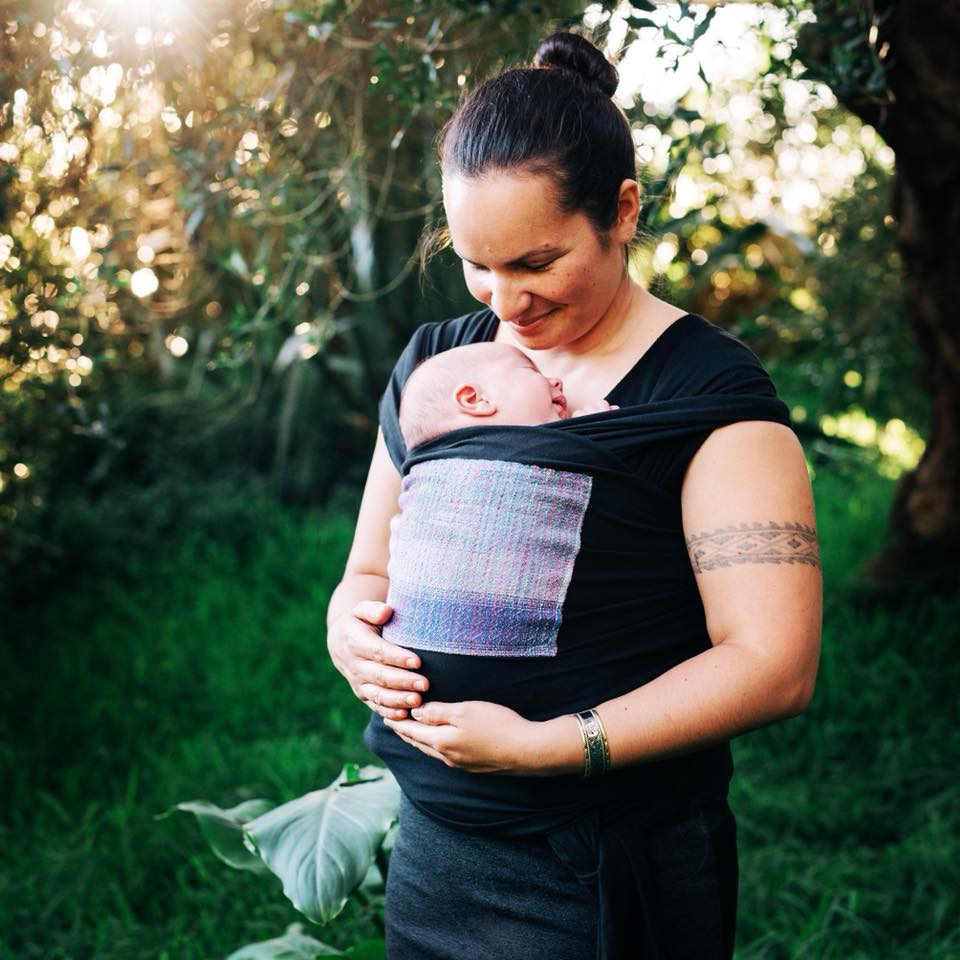Ring Sling – a one shoulder carrier that relies on tension to hold pēpi in place. Suitable from newborn and can be used in a front, hip, or back carry.