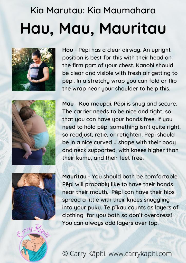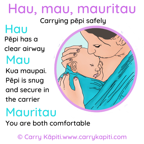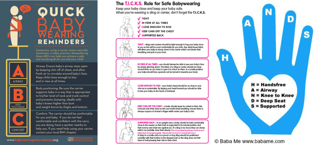 I don’t know about you, but even after 5 years of babywearing volunteering and training, I still stumble over the popular safety guidelines TICKS. I get confused around the C-K-S, and I feel like some of the letters mean the same thing anyway…. ABC is another one which is ok, and I learned HANDS during my Slingababy training which again was ok, but I really wanted something awesome. For me, the important parts are baby having a clear airway and that pēpi won’t fall out.